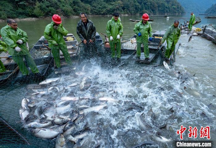 当天,由新余市仙女湖渔业公司巨网捕捞队收网捕获的8万多斤有机鱼运往广东、河南等市场。 赵春亮 摄
