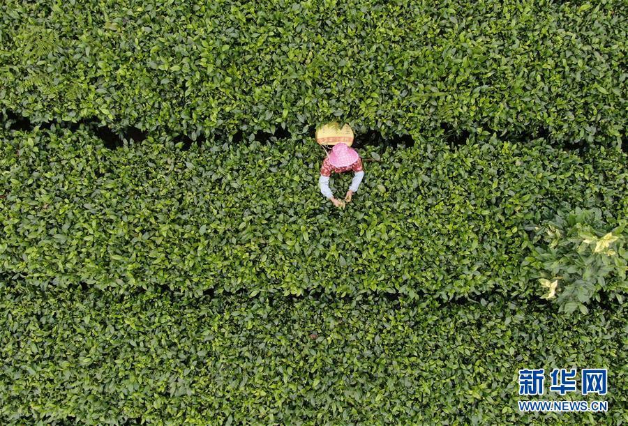 在广东英德市积庆里红茶谷的茶园里,采茶工在采摘秋茶(11月3日摄,无人机照片)。新华社记者 邓华 摄