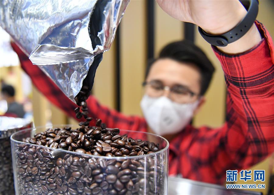 11月5日,Tims咖啡展台工作人员往咖啡机里加咖啡豆。 在第三届中国国际进口博览会食品及农产品展区,来自全球的各种美食既吸引眼球,又满足味蕾。 新华社记者 陈晔华 摄