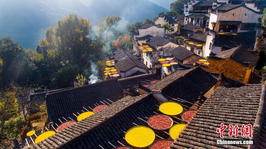 11月7日,立冬时节已至,江西省上饶市婺源篁岭古镇仍沉浸在秋日暖阳的照耀下。晒秋与赏秋齐上阵,晒盘里五颜六色的农作物与大自然交相呼应,将满山秋色增添了斑斓的色调。文/王越玥 方华彬 摄