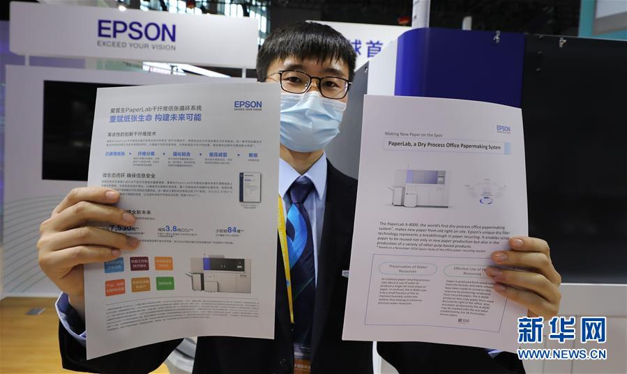 11月5日,在第三届进博会技术装备展区的爱普生公司展台,工作人员展示无水再生纸系统生产的纸张(左)和普通纸张的打印样品。爱普生今年首次参展进博会,其带来的无水再生纸系统通过创新的干纤维技术,不使用水资源也能让废纸变成新纸。 在第三届中国国际进口博览会上,近50家世界500强及行业龙头企业首次参展,覆盖全部六大展区。“新面孔”不断加入“进博朋友圈”,“进博效应”已成为企业开拓更大市场的新动力。 新华社记者 方喆 摄