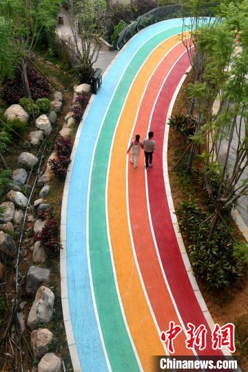 11月9日,游客在福州郊野公园的彩虹步道游玩。福州郊野公园新增的彩虹步道成为一处“网红”打卡点,吸引许多民众前去游览。