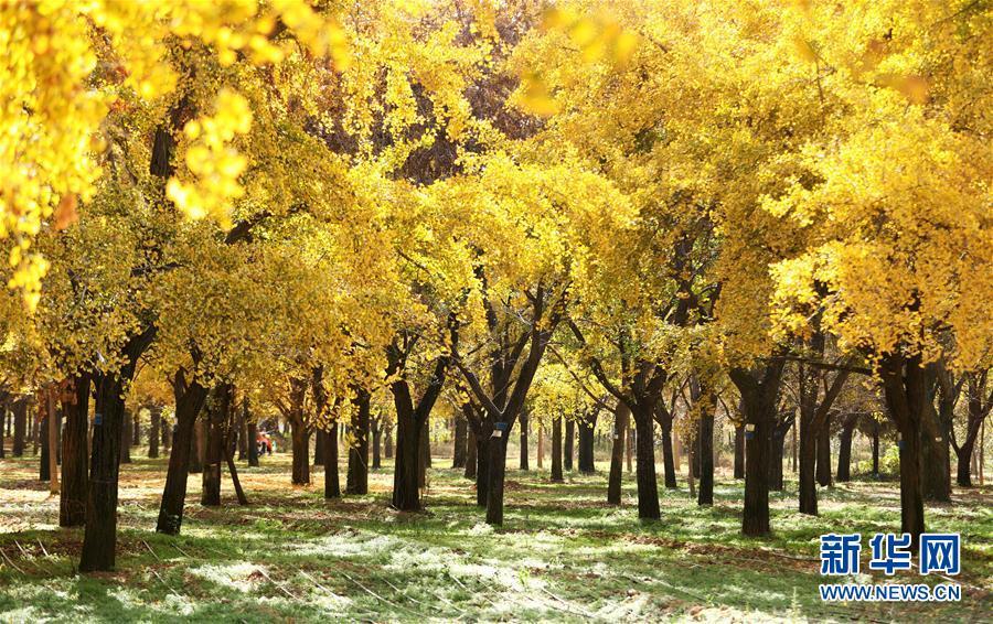 11月8日,游客在山东省临沂市郯城县一处银杏林观赏美景。 初冬时节,山东省临沂市郯城县银杏林一片金黄,美景如画。 新华社发(张春雷 摄)