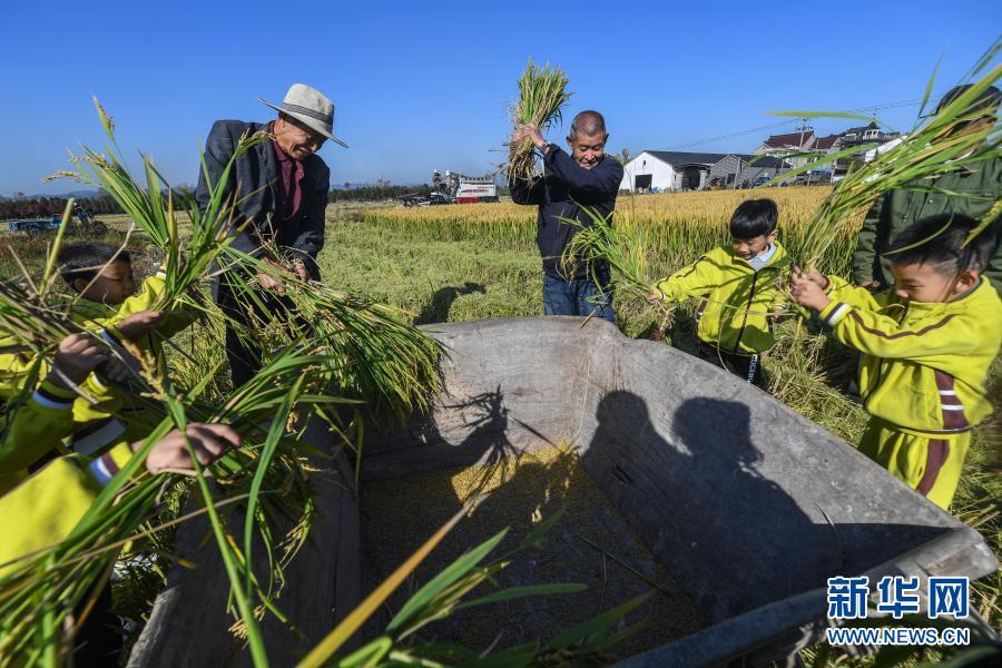 11月11日,小朋友在村民和老师的带领下体验用传统打谷桶收获稻谷。新华社记者 徐昱 摄