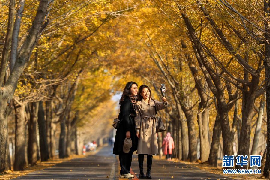 11月11日,游客在“银杏隧道”拍照留念。眼下,江苏省邳州市的一片银杏林进入最佳观赏期,“披金”的银杏林吸引众多游客前来赏景拍照。新华社发(汤德宏 摄)