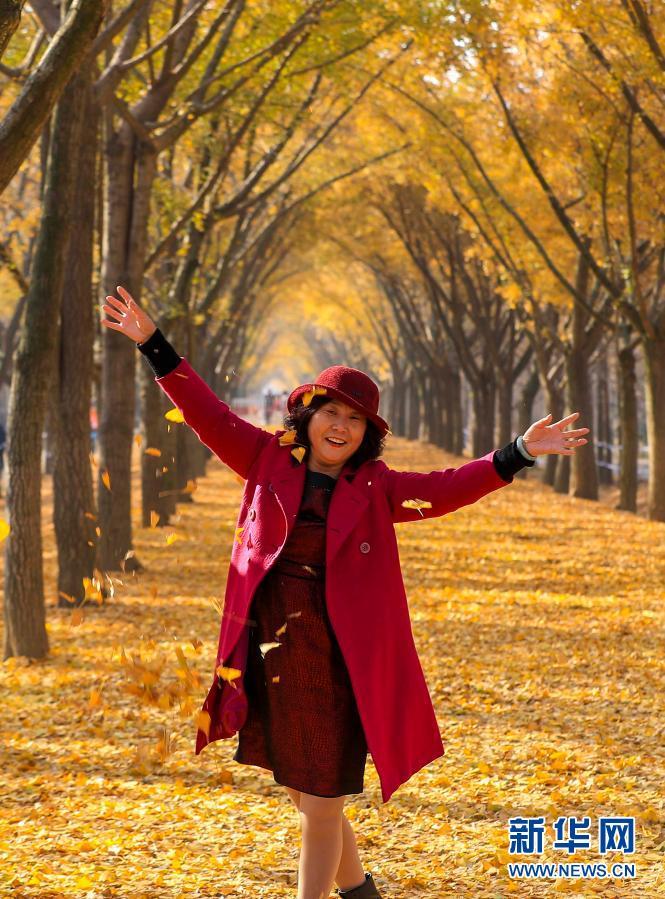 11月11日,游客在“银杏隧道”拍照留念。眼下,江苏省邳州市的一片银杏林进入最佳观赏期,“披金”的银杏林吸引众多游客前来赏景拍照。新华社发(汤德宏 摄)