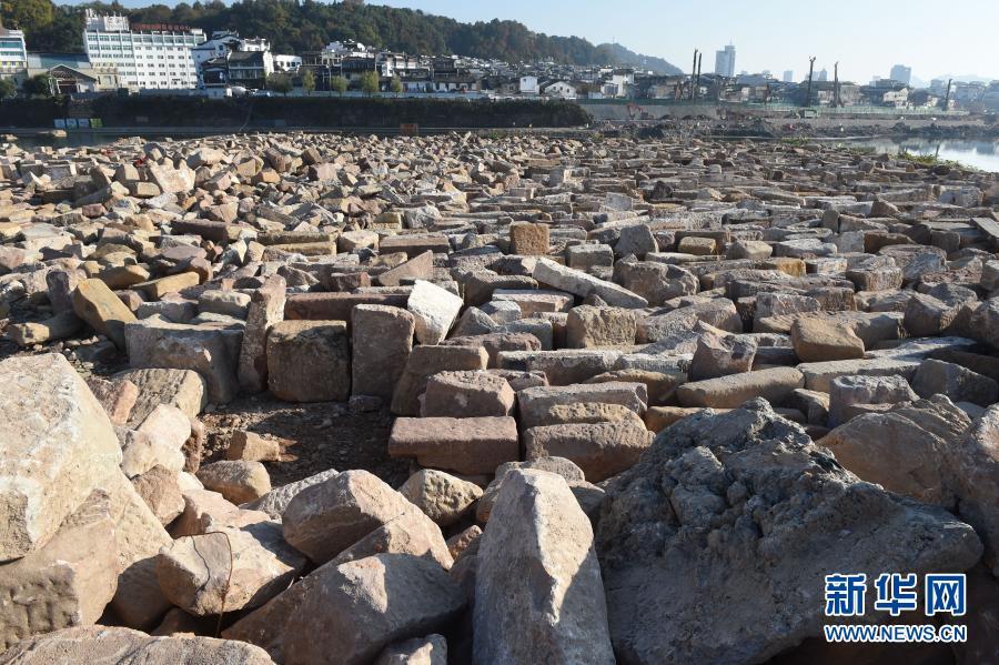 这是11月12日拍摄的打捞上来的镇海桥石料构件。 新华社记者 周牧 摄