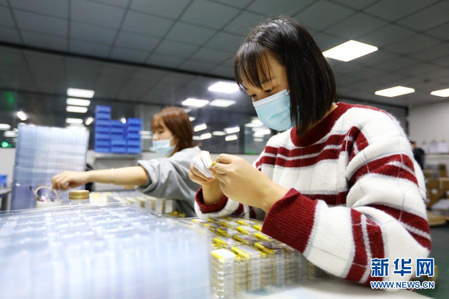 11月14日,在安徽省淮北市烈山经济开发区,工人在一家锂电池生产企业包装车间检验产品质量。新华社发(万善朝 摄)