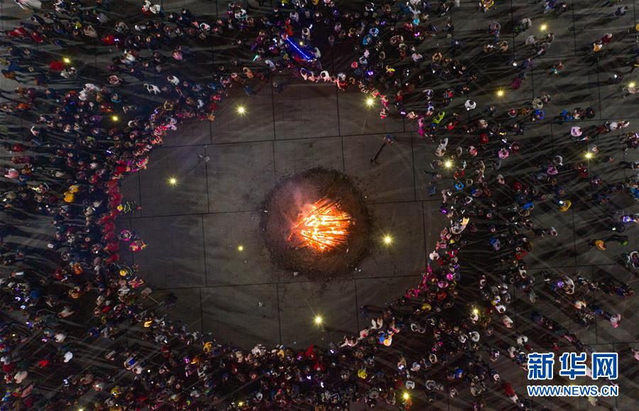 11月14日,在北川县新生广场,当地群众围着篝火跳舞,欢庆羌历新年(无人机照片)。 当日,以“幸福羌年 五彩北川”为主题的2020羌历新年系列活动在四川省北川羌族自治县开幕。当地羌族群众身着盛装,把羌族民俗节庆礼仪与歌舞表演相结合,以文艺汇演、沙朗舞展演、篝火晚会等方式,庆祝羌历新年。 新华社记者 江宏景 摄