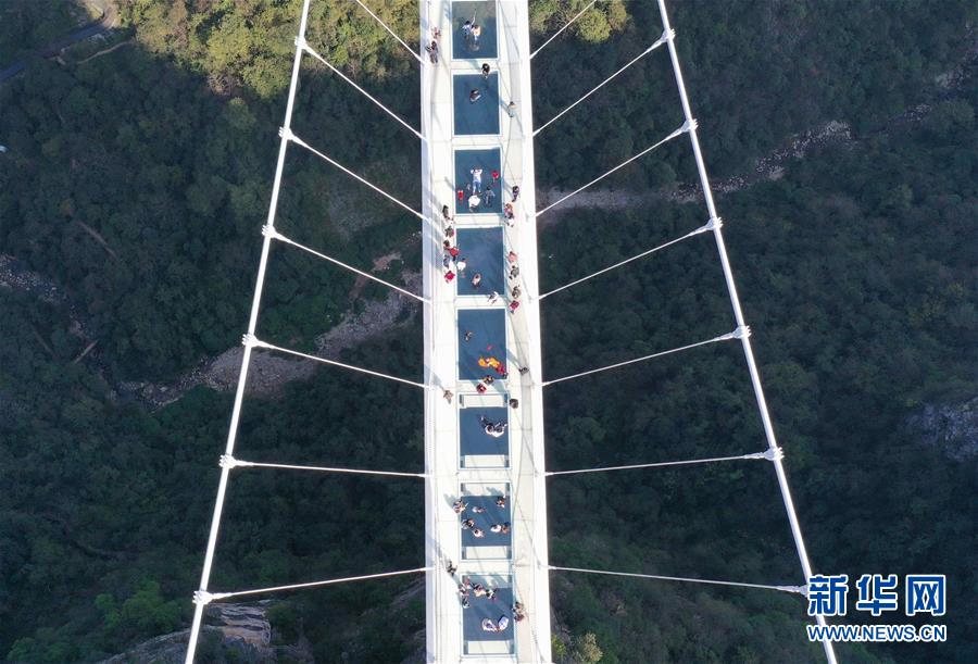 11月14日,人们在张家界大峡谷景区高空玻璃桥上游览(无人机照片)。 初冬时节,湖南省张家界市连续多日天气晴好,人们在当地景区体验攀岩、滑索等运动游览项目,乐享户外休闲的乐趣。 新华社发(吴勇兵 摄)