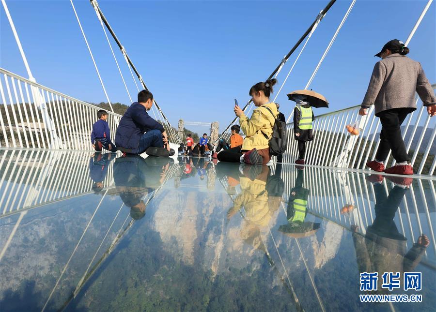 11月14日,人们在张家界大峡谷景区高空玻璃桥上游览。 初冬时节,湖南省张家界市连续多日天气晴好,人们在当地景区体验攀岩、滑索等运动游览项目,乐享户外休闲的乐趣。 新华社发(吴勇兵 摄)