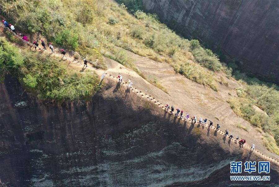 11月14日,人们在张家界市慈利县红岩岭户外拓展运动欢乐园登山游览(无人机照片)。 初冬时节,湖南省张家界市连续多日天气晴好,人们在当地景区体验攀岩、滑索等运动游览项目,乐享户外休闲的乐趣。 新华社发(吴勇兵 摄)