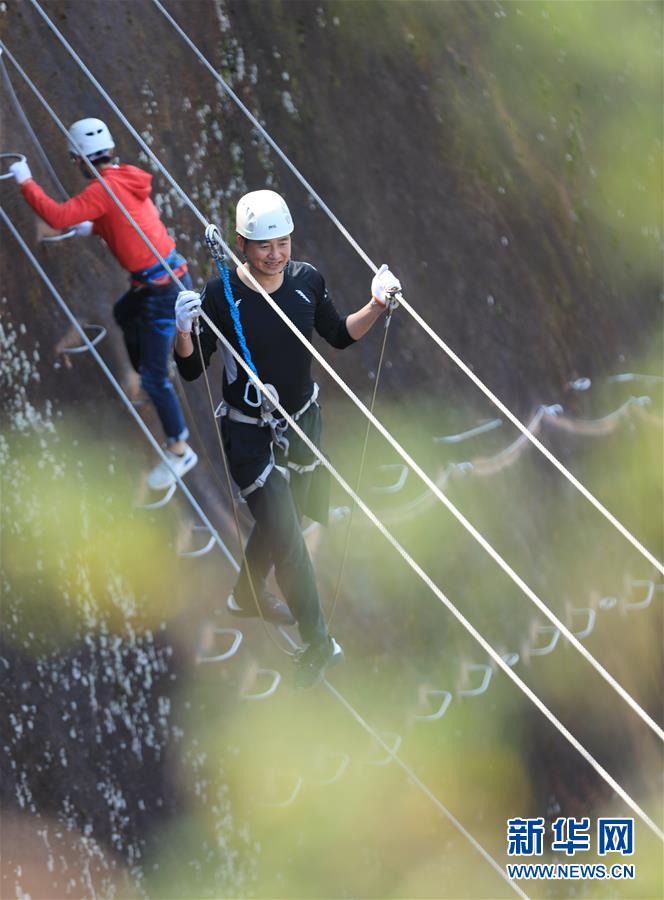 11月14日,人们在张家界市慈利县红岩岭户外拓展运动欢乐园体验高空钢索吊桥项目。 初冬时节,湖南省张家界市连续多日天气晴好,人们在当地景区体验攀岩、滑索等运动游览项目,乐享户外休闲的乐趣。 新华社发(吴勇兵 摄)
