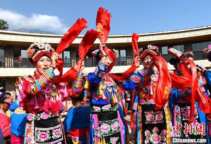 羌族民众在坝坝宴上载歌载舞。 安源 摄