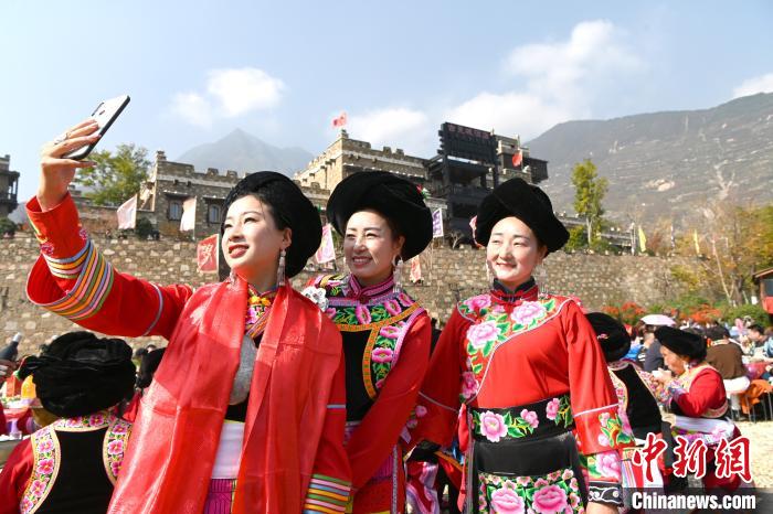 羌族民众在坝坝宴上自拍留念。 安源 摄