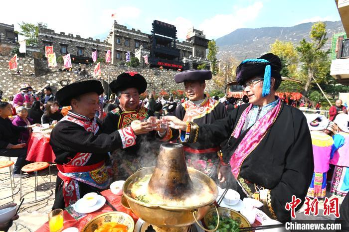 11月15日,农历十月初一是传统的羌历新年,四川茂县在古羌城萨朗广场举办坝坝宴喜庆羌年。宴请八方游客共庆羌族新年,在席间,羌族姑娘小伙唱起欢快的祝酒歌,让民众在品味羌族美食的同时融入羌年的欢庆之中。