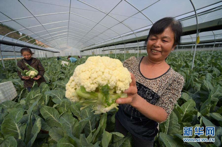 11月15日,村民在玉屏侗族自治县新店镇洞坪村蔬菜种植基地采摘花菜。新华社记者 杨楹摄