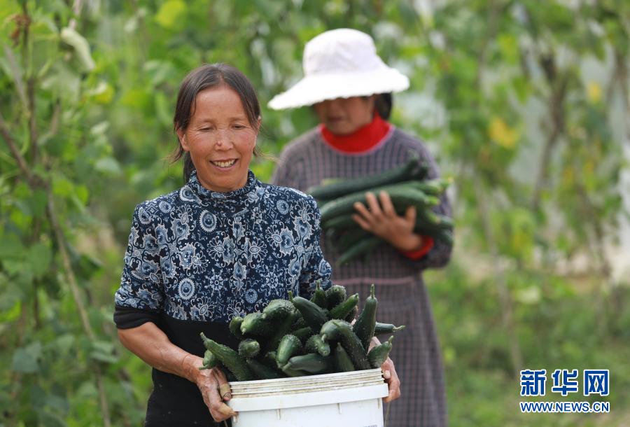 11月15日,村民在玉屏侗族自治县新店镇洞坪村蔬菜种植基地大棚里采收黄瓜。新华社发(欧秀灯 摄)
