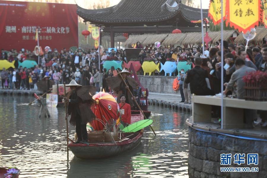 当日,浙江湖州南浔区第十二届鱼文化节在和孚镇荻港村举行,游客看表演,品民俗,尝鱼味,体验传统丰收场景。