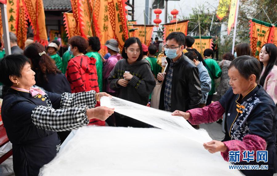 11月15日,和孚镇荻港村村民在展示手工制作蚕丝被的传统技艺。
