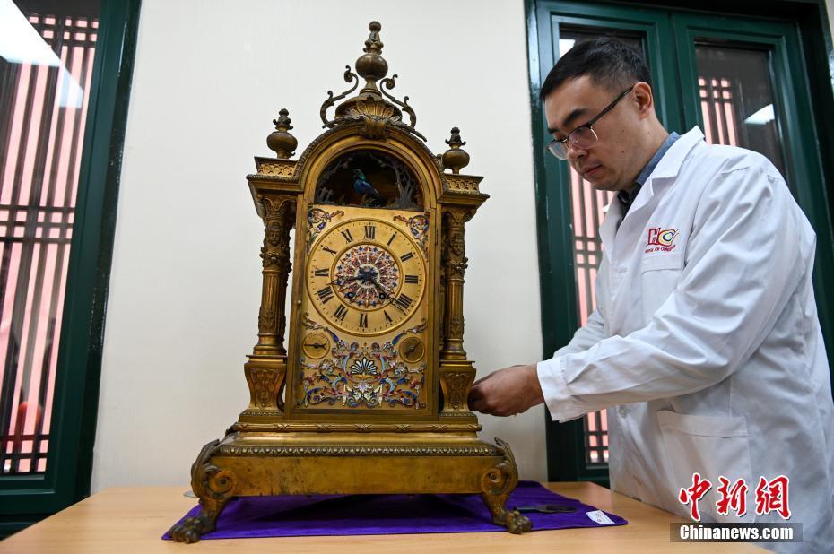 11月16日,工作人员给清铜镀金鸟音座钟上弦。当日,故宫博物院与沈阳故宫博物院共同成立的“古钟表联合修复室”揭牌仪式在辽宁沈阳举行。揭牌仪式上,5座于近日完成修复的清宫钟表亮相,其中包括清铜镀金鸟音座钟。清铜镀金鸟音座钟为19世纪末法国制造,钟上的小鸟不仅可以按时鸣唱,还可以自如地表现张嘴、摇头、摆尾等功能。 中新社记者 于海洋 摄
