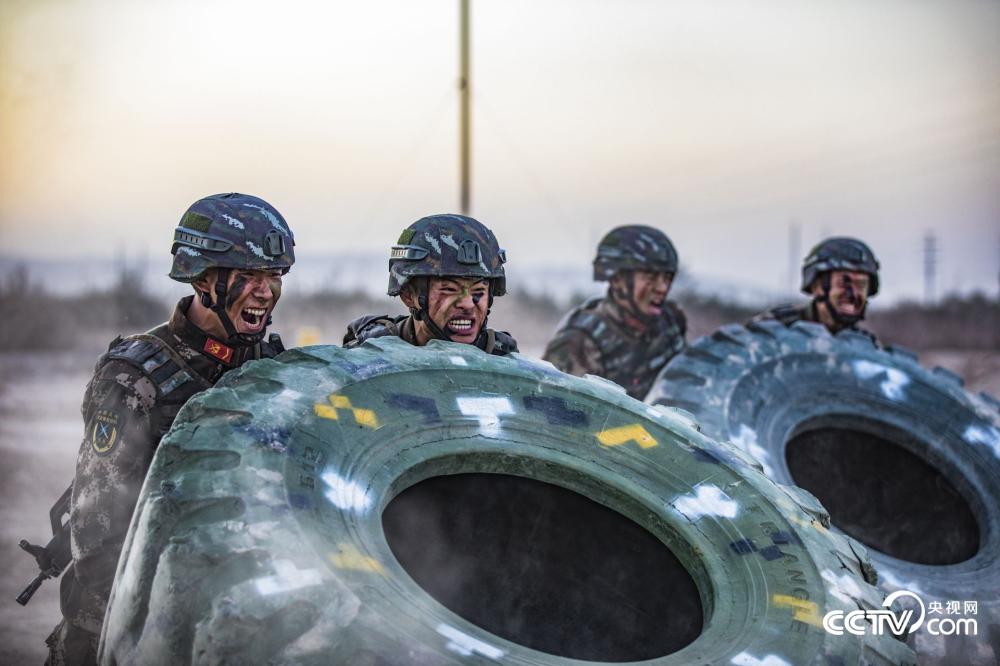 图为特战队员翻滚200公斤轮胎极限体能训练。