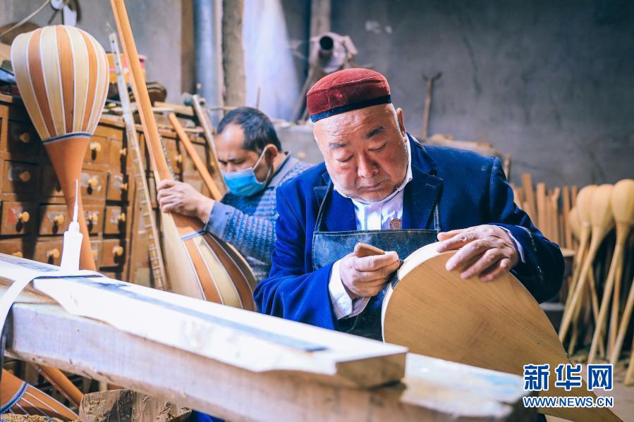 国家级“非遗”传承人艾依提·依明(右)在家中工作室和学徒一起制作乐器(11月12日摄)。新华社记者 张曼 摄