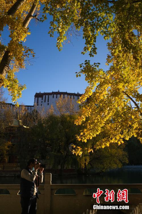 11月17日,一名游客在宗角禄康公园赏景拍照。秋冬交替,位于西藏拉萨布达拉宫脚下的宗角禄康公园内五彩斑斓,景色宜人。中新社记者 何蓬磊 摄