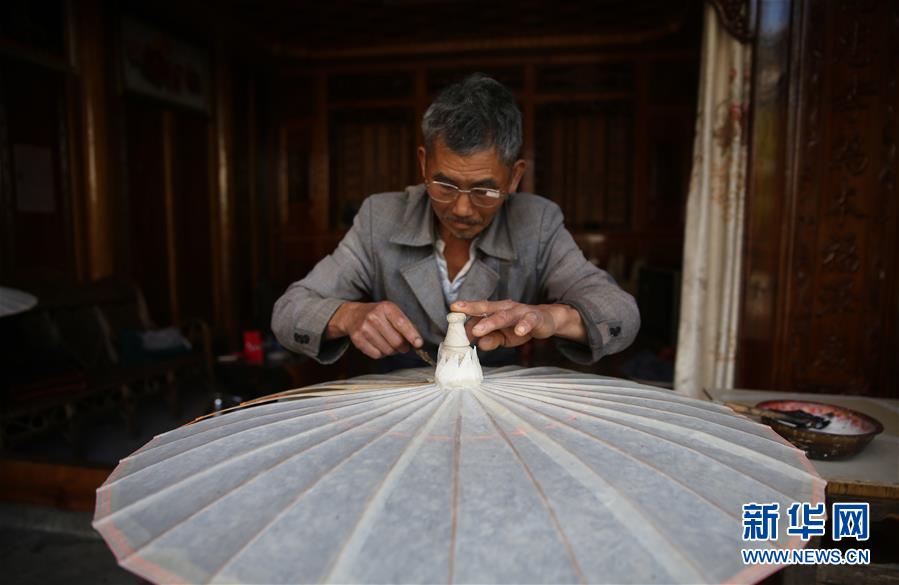 11月17日,荥阳村的纸伞艺人在制作油纸伞。 云南省腾冲市固东镇荥阳村有着上百年制作油纸伞的历史,但机制雨伞的出现和其价格优势,让手工制作的油纸伞市场越来越小。近年来,随着当地旅游业的兴起,样式别致、图案精美的油纸伞作为工艺品受到游客青睐,传承百年的油纸伞焕发了新的生机。 新华社发(梁志强 摄)