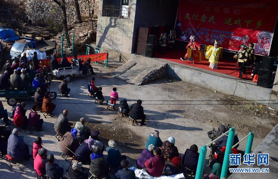11月19日,在河北省元氏县佃户营村,元氏县新秀豫剧团演员在为农村群众表演戏曲节目。