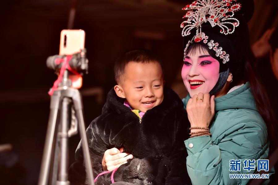 11月19日,在河北省元氏县佃户营村,元氏县新秀豫剧团的演员和当地农村小朋友一起做直播。