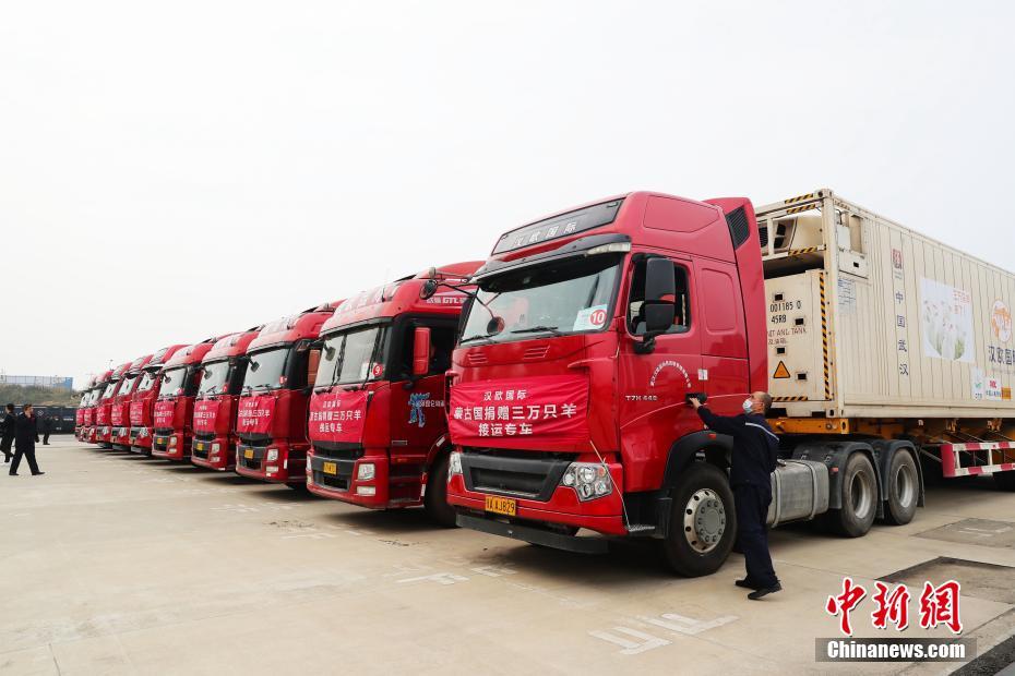 11月20日,蒙古国捐赠的首批羊抵达湖北武汉阳逻国际港,湖北省相关部门举行接车分发仪式。根据中蒙双方商定计划,3万只羊分批于11月中旬前运抵中国境内,在二连浩特加工后运往湖北。中新社记者 张畅 摄