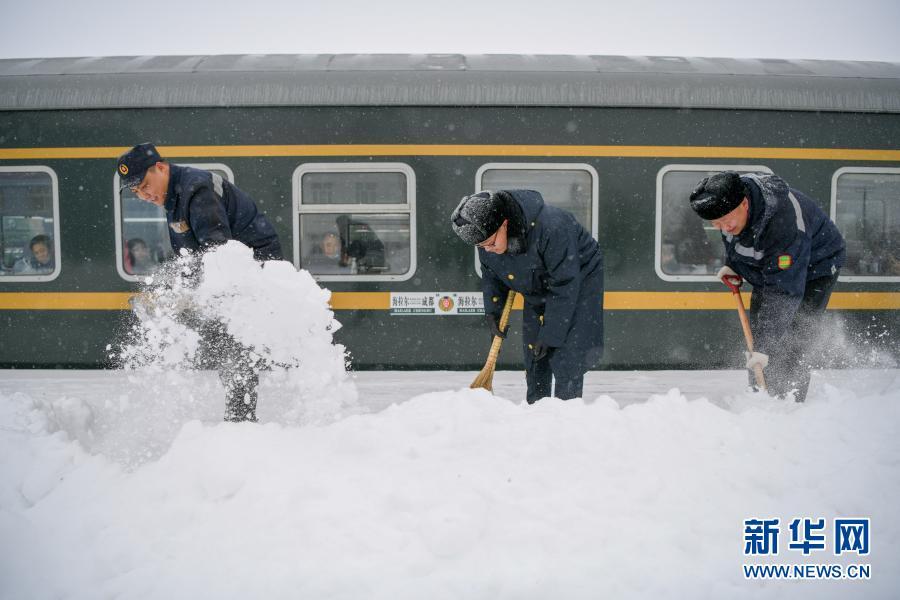 11月19日,中国铁路呼和浩特局集团有限公司大板站职工在清理站台积雪。近日,内蒙古中东部地区迎来降雪天气。中国铁路呼和浩特局集团有限公司大板机务段启动应急预案,组织人员对线路和设备进行巡查、清扫,确保运输秩序安全稳定。新华社发