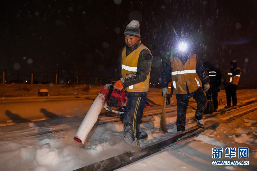 11月19日,中国铁路呼和浩特局集团有限公司大板综合维修段职工在清理线路积雪。近日,内蒙古中东部地区迎来降雪天气。中国铁路呼和浩特局集团有限公司大板机务段启动应急预案,组织人员对线路和设备进行巡查、清扫,确保运输秩序安全稳定。新华社发