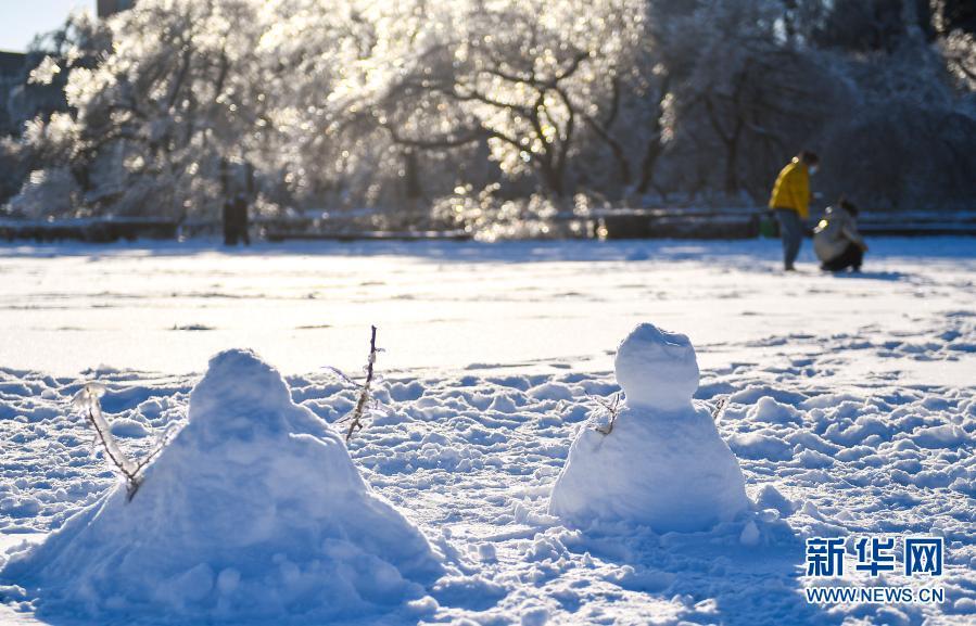 11月20日在长春市文化广场拍摄的雪地中的两个雪人。一轮强雨雪大风冰冻天气过后,20日,吉林省长春市雪后初晴,整个城市一片银装素裹,宛如冰雪童话世界。新华社记者 许畅 摄