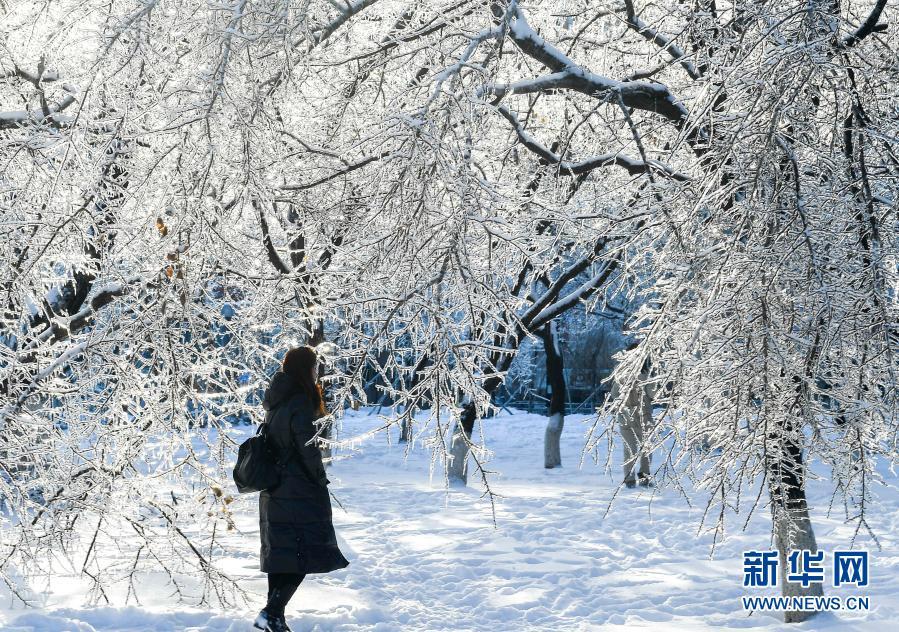 11月20日,市民在长春市文化广场欣赏雪景。一轮强雨雪大风冰冻天气过后,20日,吉林省长春市雪后初晴,整个城市一片银装素裹,宛如冰雪童话世界。新华社记者 许畅 摄