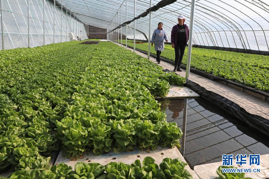11月20日,德胜村农民在温室水培蔬菜大棚查看蔬菜长势。新华社发(武殿森 摄)