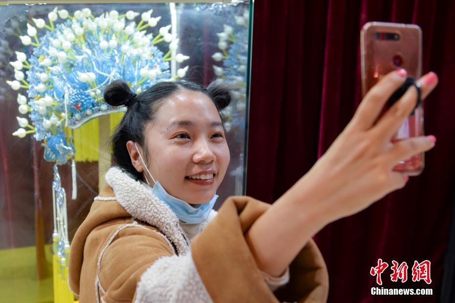 11月20日,北京天桥艺术中心,参观者在京津冀非遗精品展上与展品自拍合影。北京、天津、河北三地联袂举办的“京津冀非遗精品展”于11月19日至25日在北京天桥艺术中心举行。中新社记者 田雨昊 摄