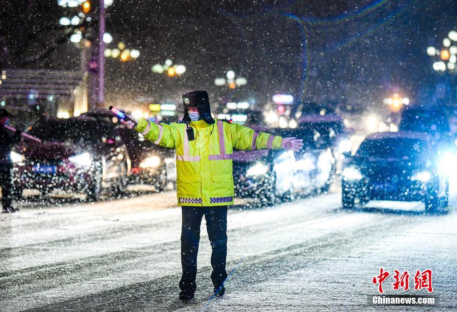 乌鲁木齐持续降雪道路湿滑 交警雪中坚守岗位