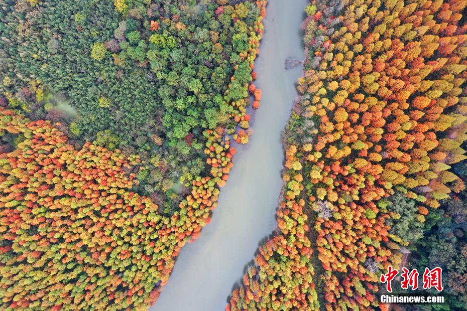 11月20日,在湖北省荆门市太子山国家森林公园,似火的红杉林扎根水中,如同“水上火焰”。太子山国家森林公园位于江汉平原北缘,总面积7930公顷,森林覆盖率达85%,集旅游观光、休闲度假、考古探密、科普教育、生产科研等功能于一体。目前,公园内仙女紫薇园附近的数百亩红杉林(池杉、水杉)正进入最佳观赏期。 彭琦 摄