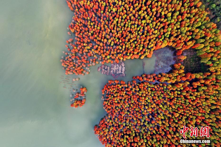 航拍湖北太子山美景 成片红杉宛如“水上火焰”