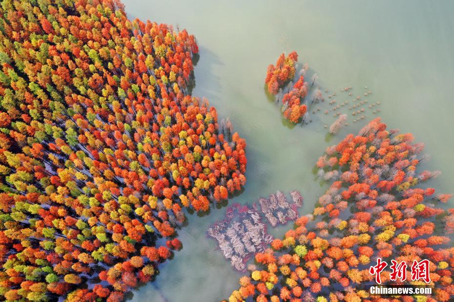 航拍湖北太子山美景 成片红杉宛如“水上火焰”