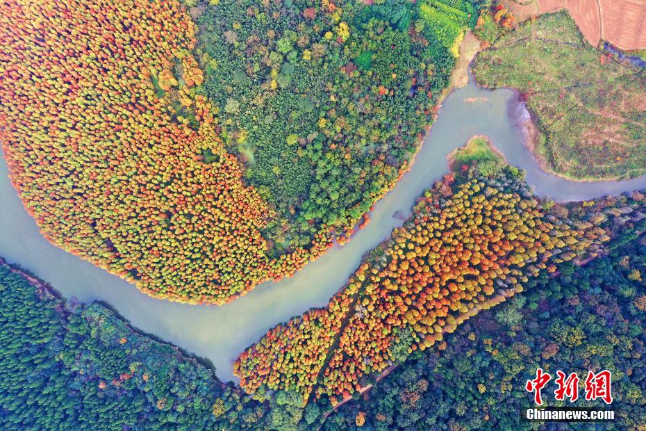 航拍湖北太子山美景 成片红杉宛如“水上火焰”