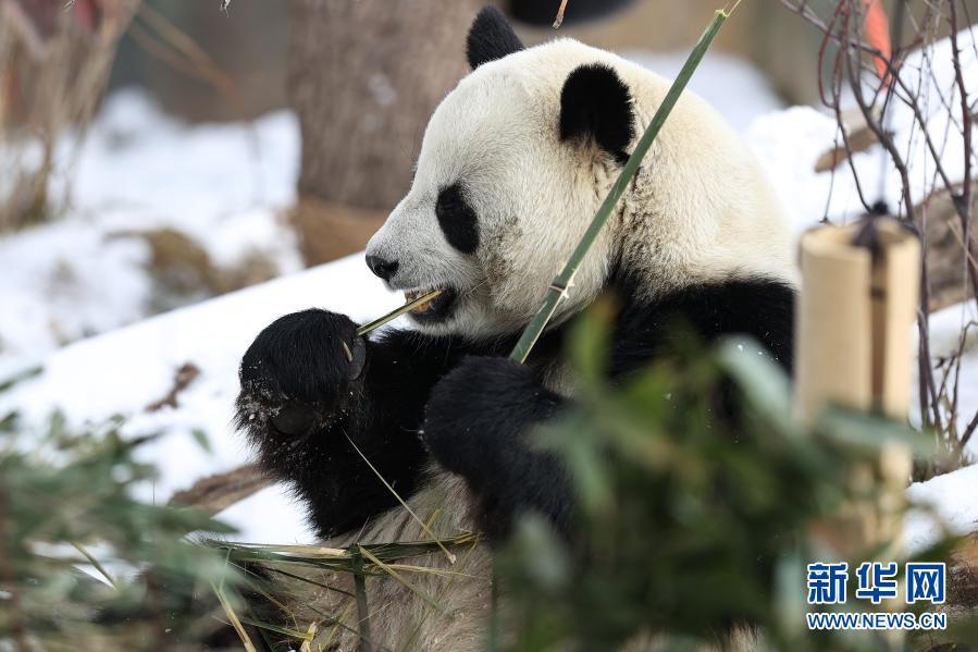11月21日,西宁市熊猫馆一只大熊猫在吃竹子。近日,受冷空气影响,青海省西宁市迎来降雪。西宁熊猫馆的四只大熊猫在雪天里享受着吃竹子、“打盹儿”的乐趣。  新华社记者 吴刚 摄