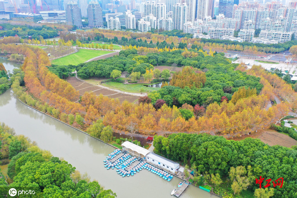2020年11月23日,上海,申城秋色初现,浦东世纪公园高大的法国梧桐树组成了一条“金项链”,蜿蜒千余米,堪比南京美龄宫“最美项链”。