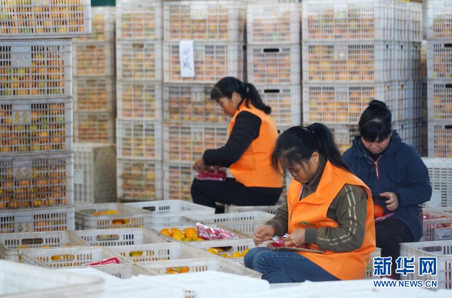 11月24日,在瑞金市叶坪乡一家脐橙专业合作社,果农包装脐橙准备发货。