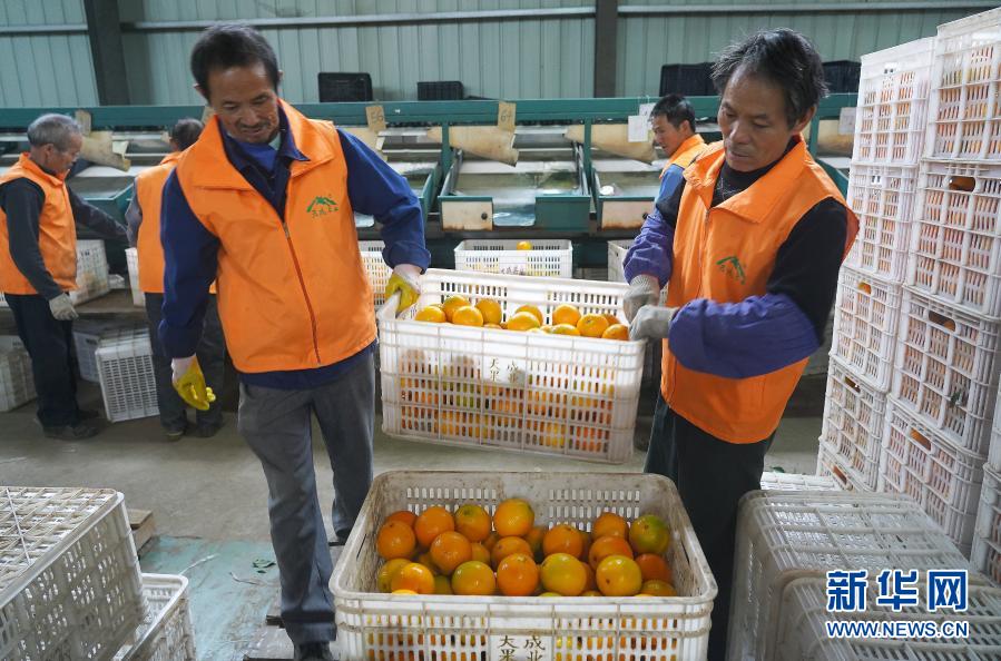 11月24日,在瑞金市叶坪乡一家脐橙专业合作社,果农搬运脐橙准备发货。