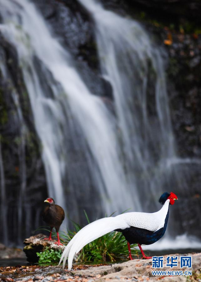 在永安市青水畲族乡丰田村,两只白鹇在瀑布前休憩(11月21日摄)。