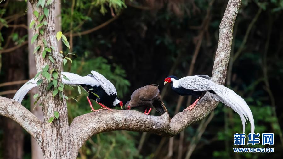 在永安市青水畲族乡丰田村,几只白鹇在林间的树枝上嬉戏(11月20日摄)。