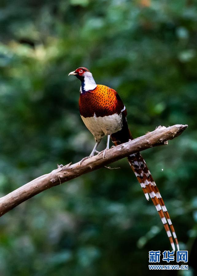 在永安市青水畲族乡丰田村,一只白颈长尾雉在树干上休憩(11月20日摄)。